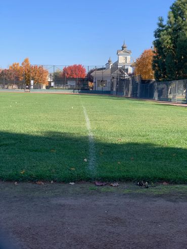Perry Gibson, and Ray Rothbardt dragging the infield on golf cart.